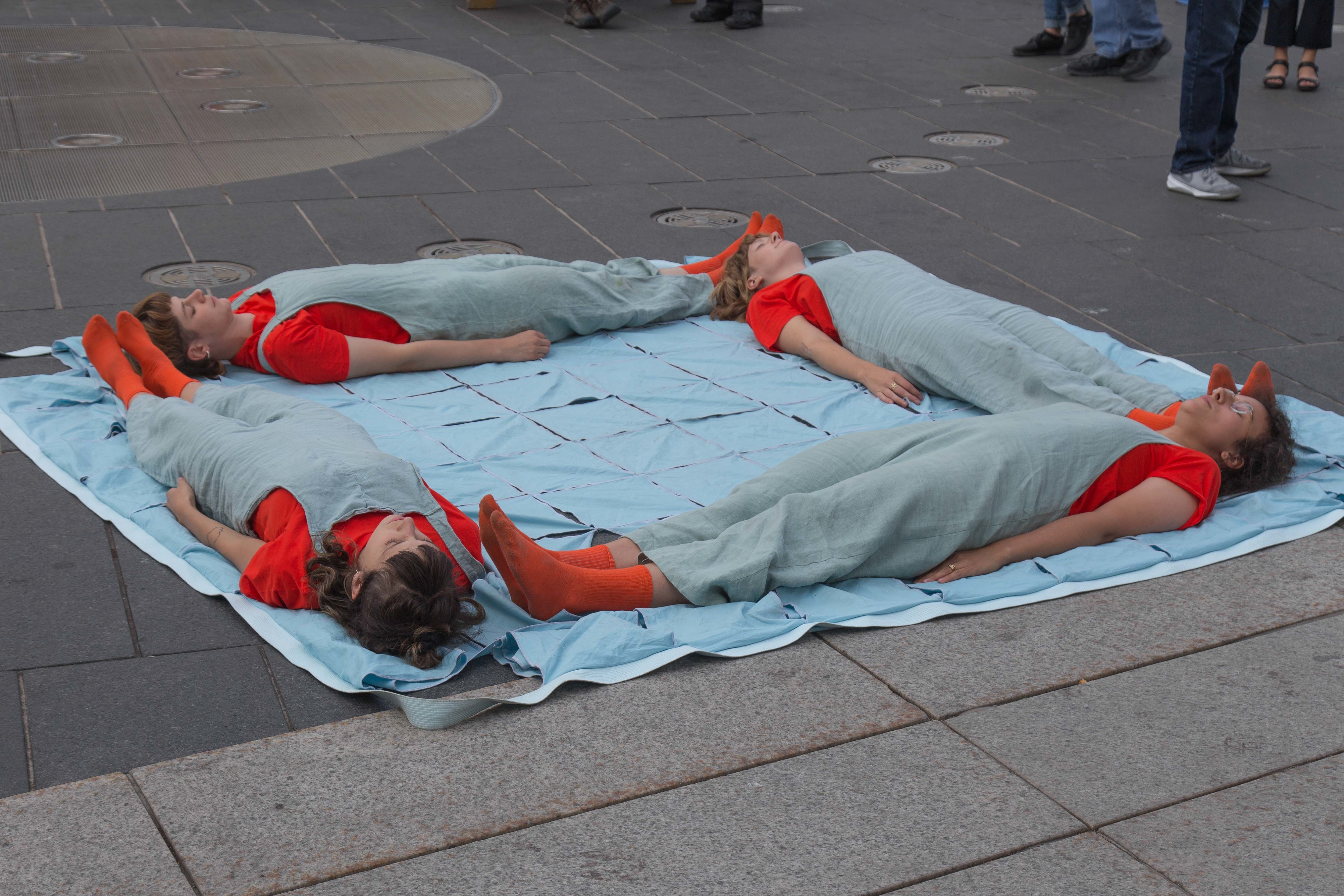Nous-tendre prend comme matériaux le mouchoir rattaché et répété comme objet d'expansion et de communion. Le projet explore sous plusieurs aspects l'expérience du collectif et du faire-ensemble. À travers une réunion de gestes, les artistes érigent une architecture qui prend forme sous l’effet d’une tension tenue par leurs quatre corps piliers.