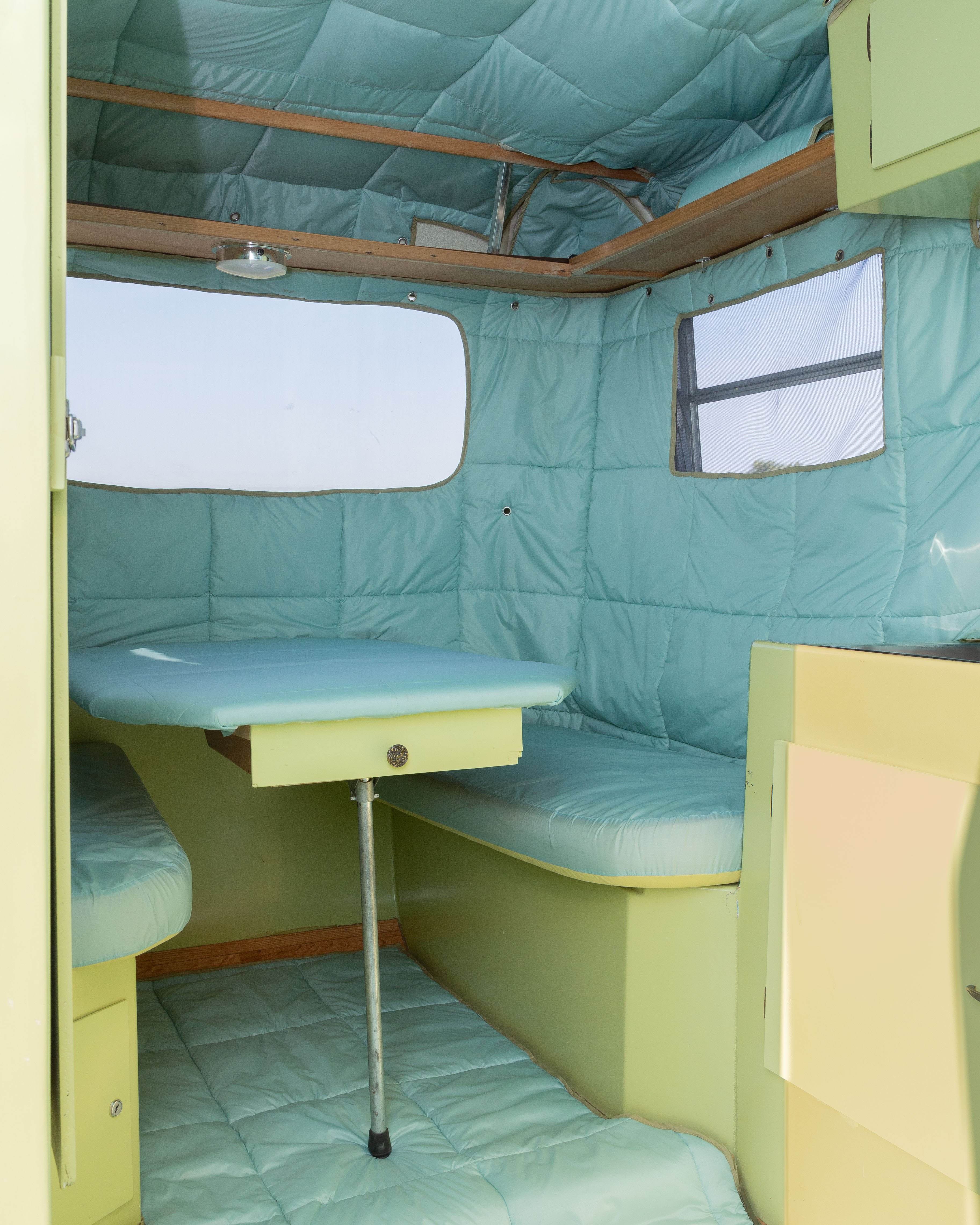 Dans le cadre du projet entre-bleu, le doux soft club investit les surfaces intérieures de la Vrille mobile par l’emploi de couvertures rembourrées aux teintes de bleu et de vert pâle. Les contours irréguliers de ces dernières épousent les différentes spécificités architecturales de la roulotte et s'imbriquent parfaitement à son mobilier. Par le biais de cette installation, la Vrille mobile se transforme en un espace bleu et capitonné où il est possible de se re-poser et de se dé-poser en toutes surfaces.