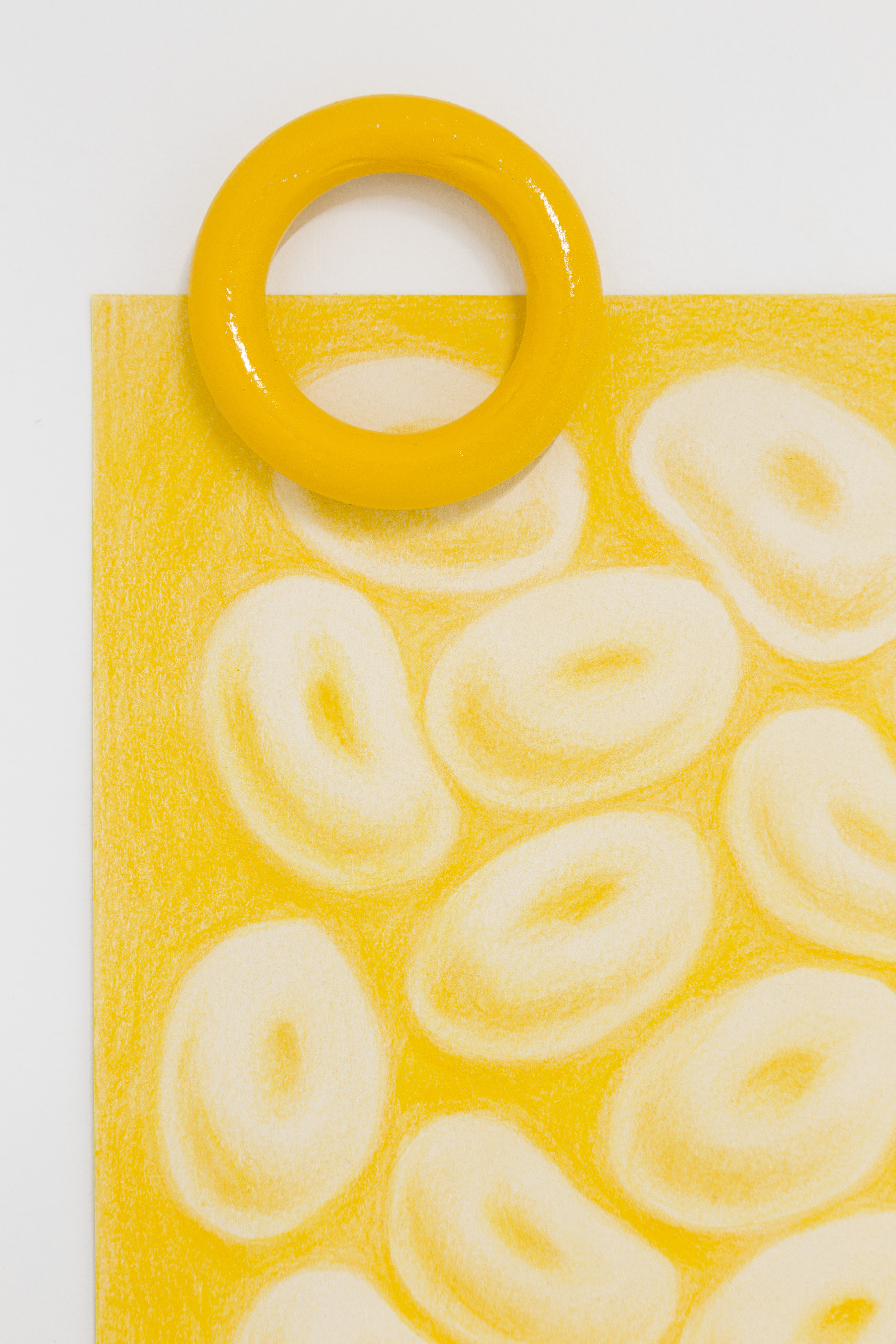 Dans la pièce parallèle, les deux artistes prolongent la réflexion et intègrent des œuvres issues de leurs pratiques respectives. Clara Cousineau rassemble à partir de bas jaunes une paire de bottes et explore les potentiels typographiques liés à l’empreinte de cette dernière. Marion Paquette déploie un univers qui évoque le microscopique. Son travail de dessin développe une imagerie qui rappelle l'omniprésence des formes circulaires jaunes au travers desquelles l'installation tentaculaire prend forme.